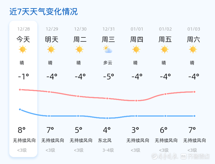 明日(12月29日)滨州天气仍以晴朗为主,但气温有所下降,预计最低气温为-4℃,最高气温为7℃。相较于今日,明日气温有所降低,市民需注意保暖。