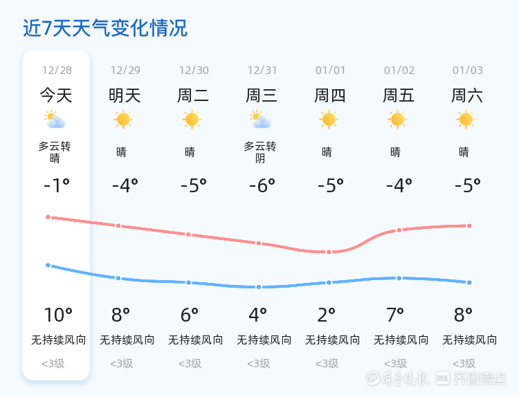 未来三天,潍坊市天气以晴到多云为主,气温波动较大,最低气温可达-5℃,最高气温在10℃左右。特别提醒市民注意保暖,尤其是早出晚归的市民,建议增添衣物,预防感冒。