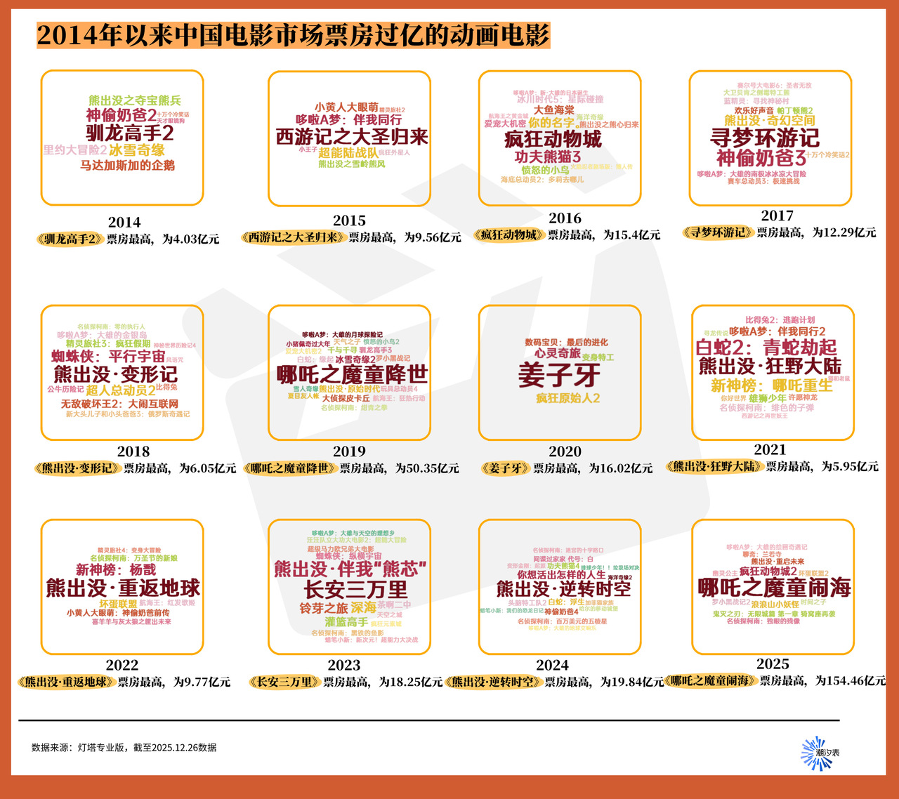 根据灯塔专业版数据,截至2025年12月26日,2014年以来,中国电影市场票房超1亿元的动画电影共137部。