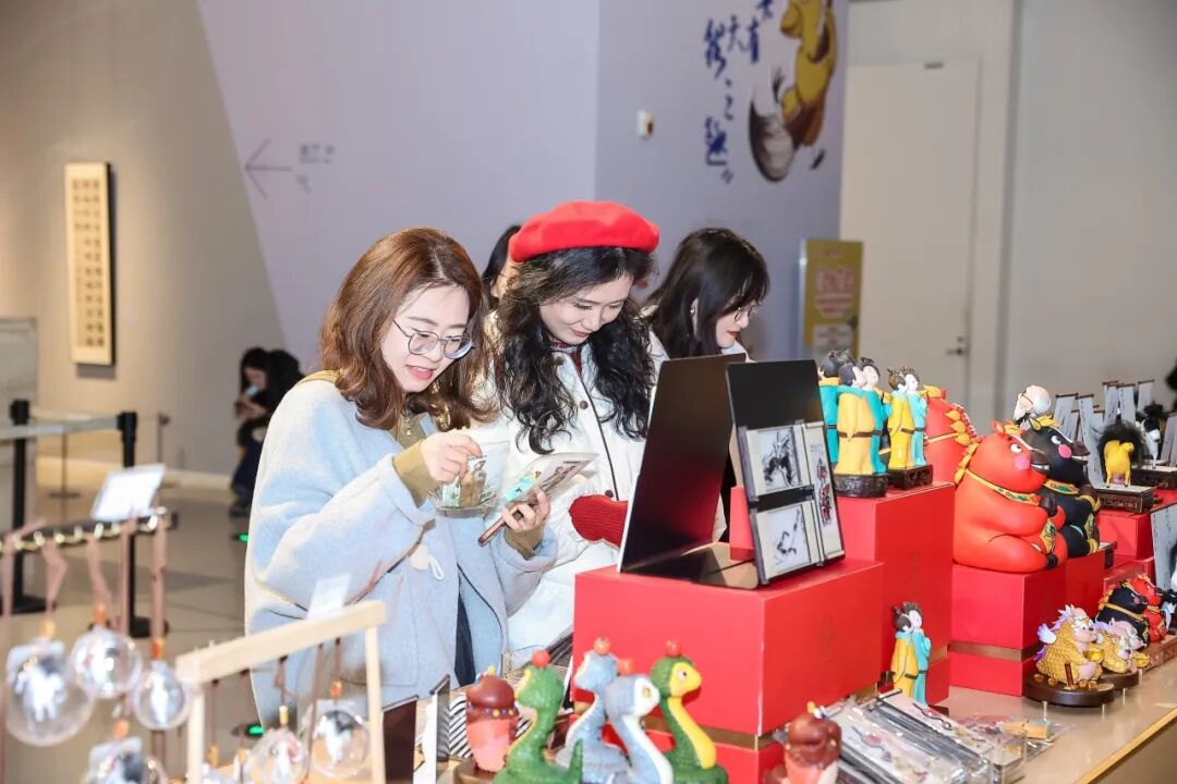 展览同时推动艺术与非遗的创意融合,在展陈与文创产品研发中亮点纷呈。从潍坊风筝悬空起舞,到聊城葫芦垂幔装饰,淄博琉璃“多福多利”摆件,泰崃天宝泰山玉文房雅器,“可爱杯盲盒”把画中虾蟹和果蔬的鲜甜化作可触可感的陪伴......为推动“艺术+工艺”“艺术+生活”深度融合,北京画院、山东美术馆、山东省旅游推广中心等携手相关文化机构与企业研发出涵盖日常好物、新年礼物等品类的400余款文创产品。齐白石画中的意象与山东地域特色的非遗作品相互融合、巧妙转化,白石画中的花鸟草虫腾跃在日常用品之上,活灵活现、别具匠心。