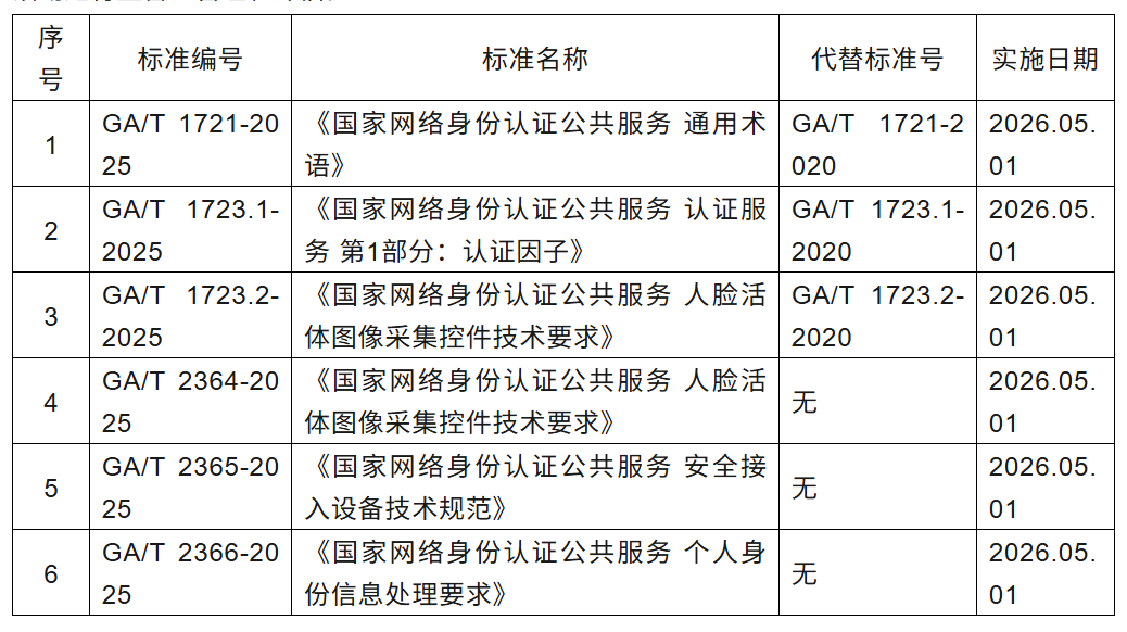 《国家网络身份认证公共服务管理办法》已于2025年5月23日发布,并于7月15日实施。为支撑法规的落地与实施,近日公安部发布了2025年第2号《中华人民共和国公安部公共安全行业标准公告》,国家网络身份认证公共服务标准体系中6项公共安全行业标准正式发布,于2026年5月1日实施。标准具体内容如下: