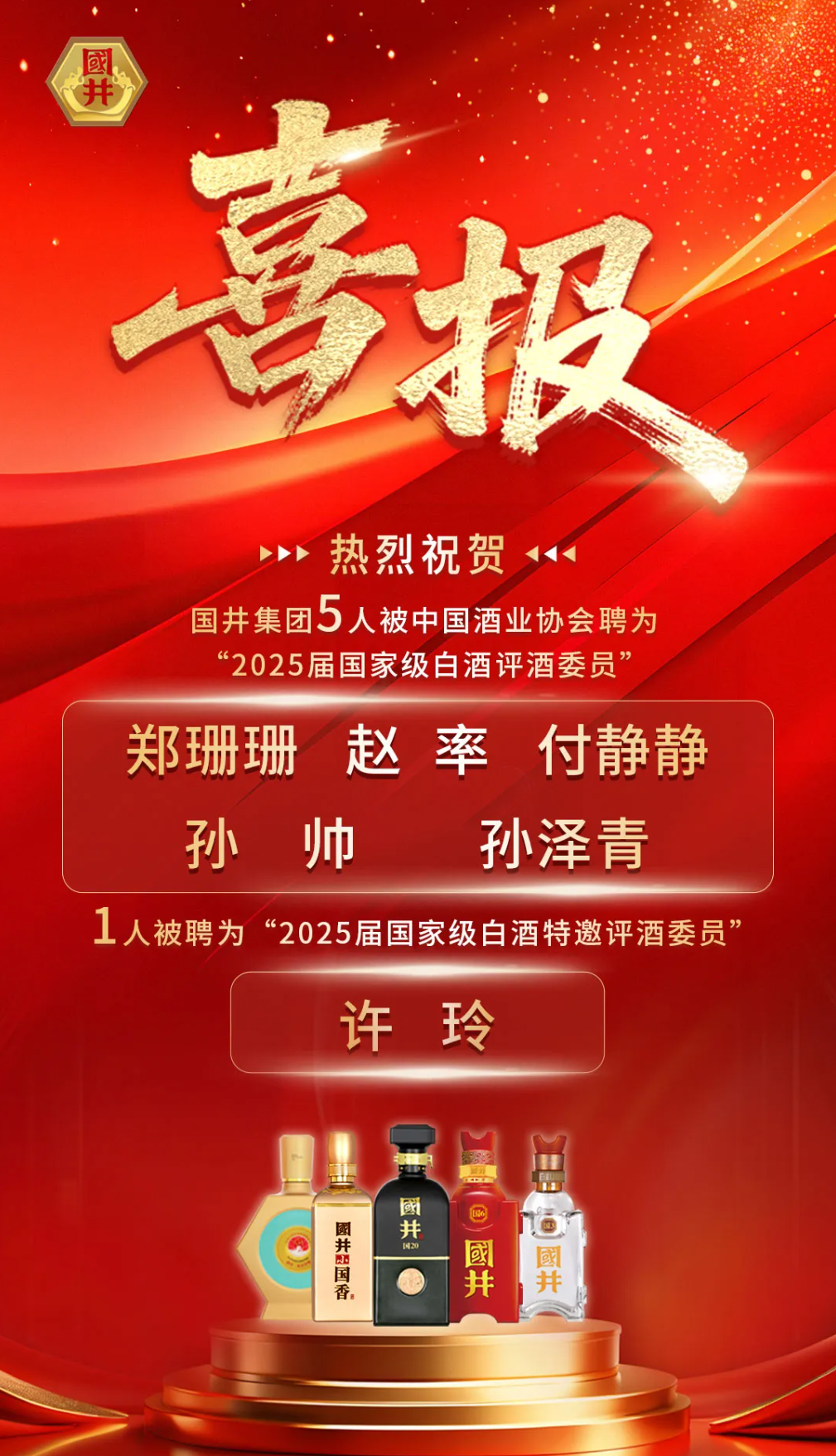 10月27日至29日,第五届全国白酒品酒职业技能竞赛决赛在重庆隆重举行。经过激烈角逐与严格考核,国井集团郑姗姗、赵率、付静静、孙帅、孙泽清五人凭借卓越的专业技能,成功获聘“国家白酒评委”,许玲获评“国家级白酒特邀评酒委员”。