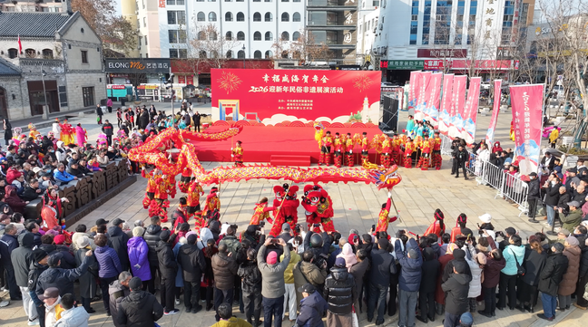 为迎接2026年新年的到来,传承和弘扬优秀传统文化,“幸福威海贺年会”2026迎新年民俗非遗展演展示活动于12月27日在威海栖霞街盛大举行。本次活动由中共威海市委宣传部、威海市文化和旅游局主办,威海市群众艺术馆承办,为市民和游客带来一场充满年味与文化魅力的盛宴。
