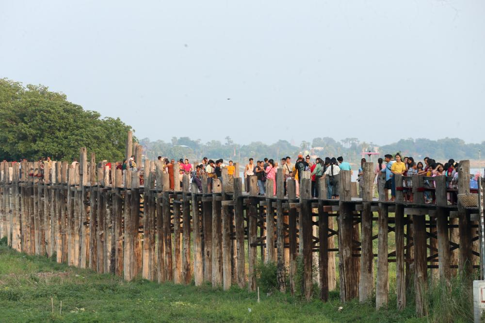 5月11日,人们在缅甸曼德勒的乌本桥上休闲。 新华社