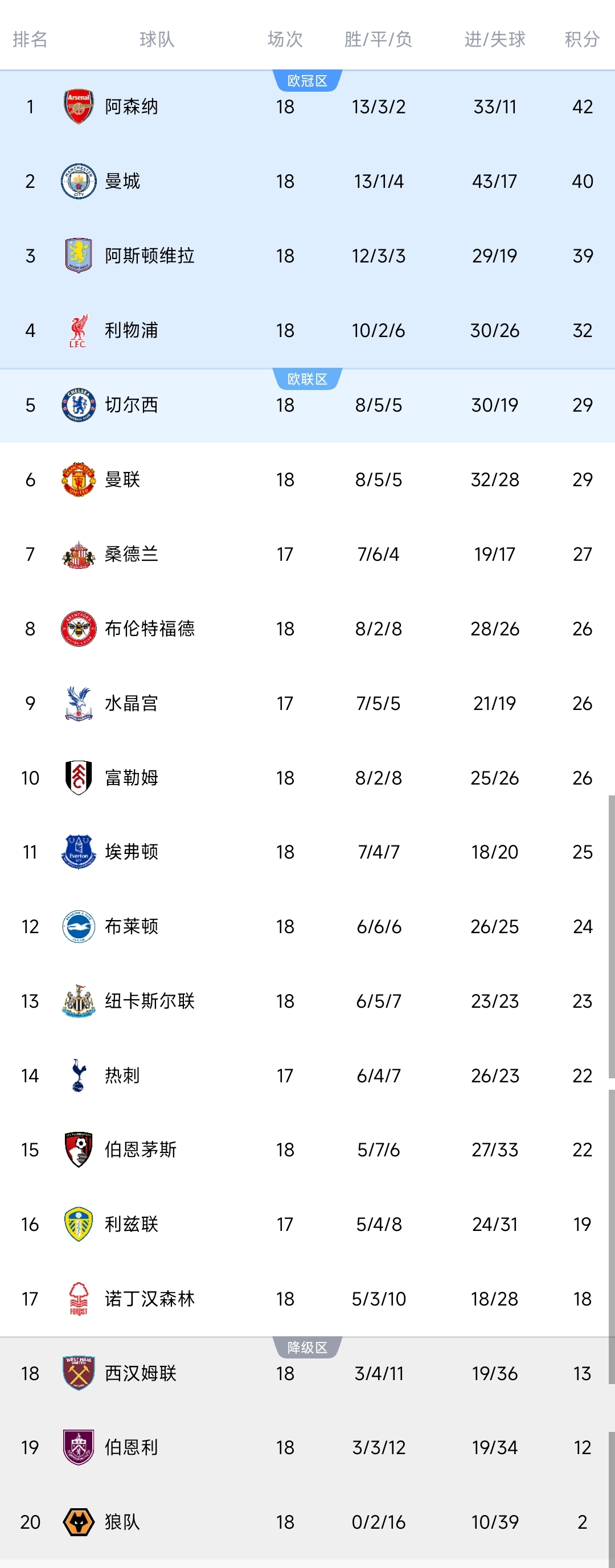 北京时间12月28日,英超第18轮,英超前三阿森纳、曼城、阿斯顿维拉均以2-1的比分告捷,1球小胜对手全取3分。阿森纳主场2-1战胜布莱顿,曼城客场2-1战胜诺丁汉森林,阿斯顿维拉客场2-1击败切尔西。英超积分榜排名前三的球队积分差距依旧是3分。