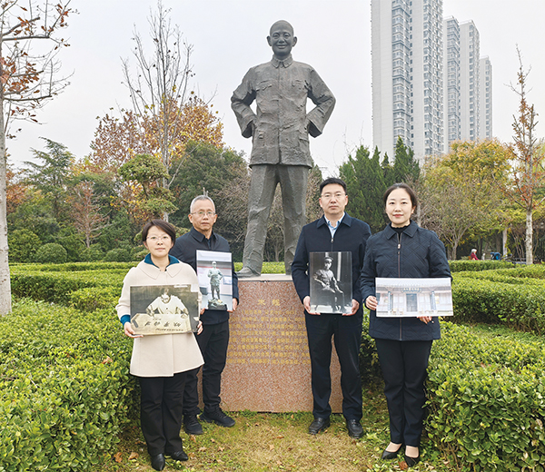 菏泽市政协委员李士英、包立强、田兴学、张莉莉(从左至右)在朱程烈士雕塑前合影。