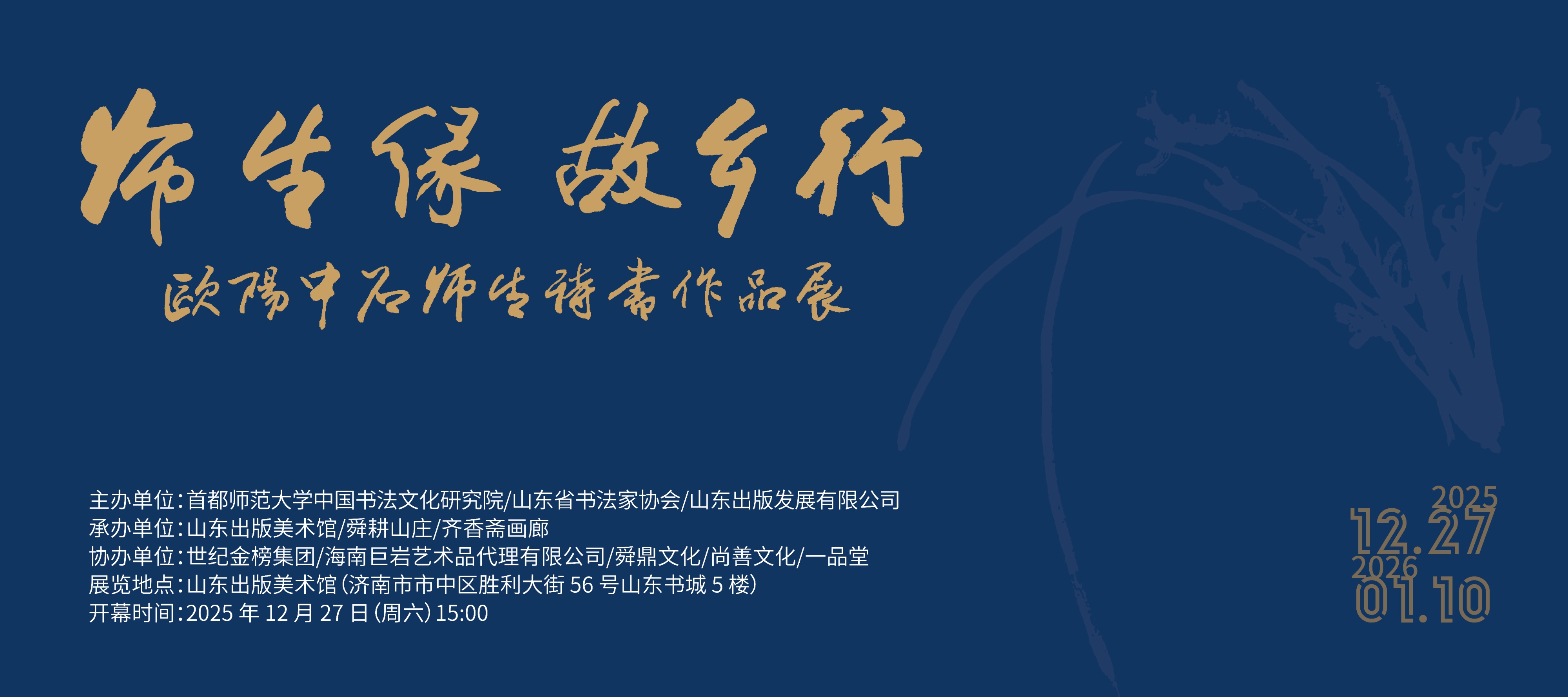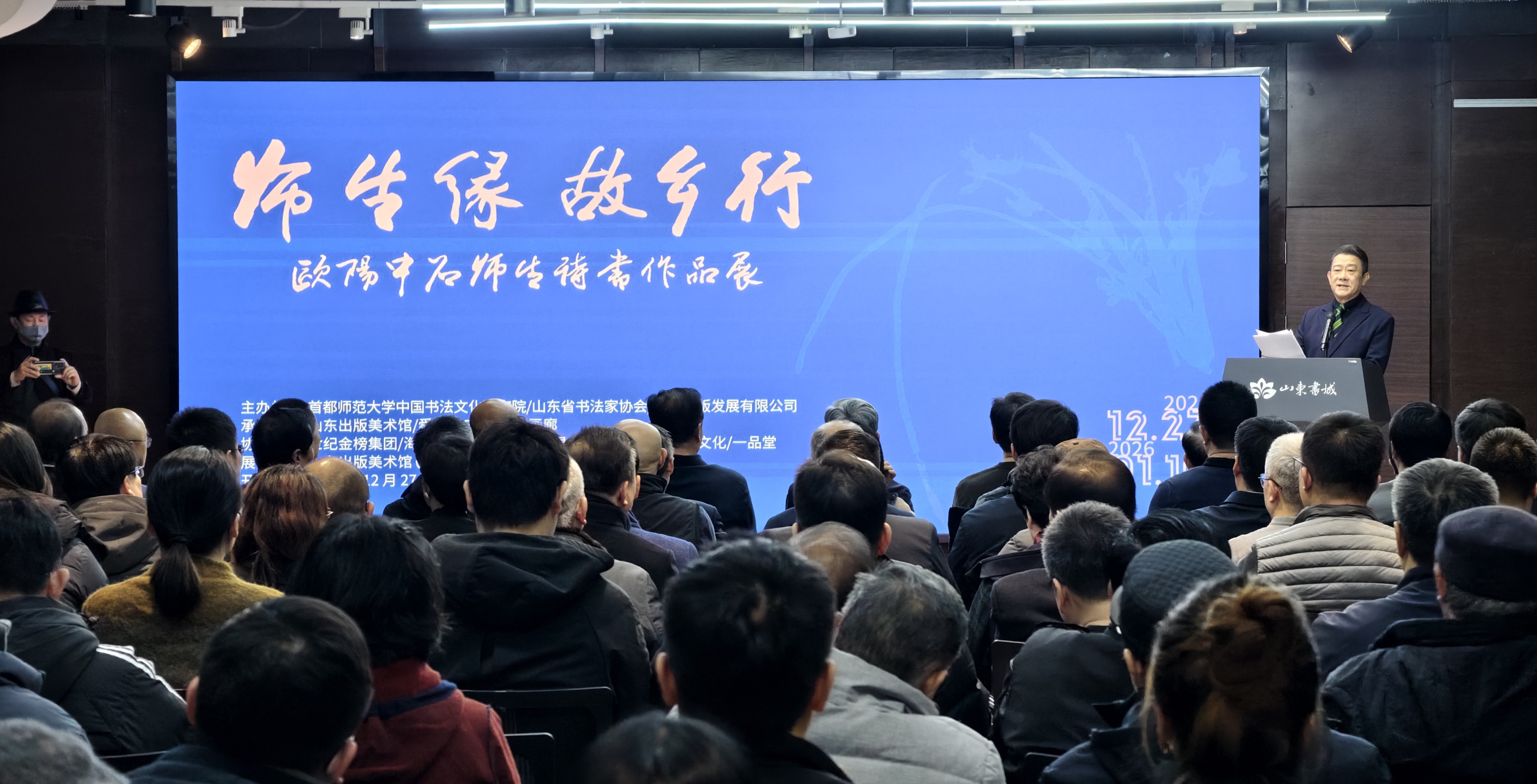 2025年12月27日,“师生缘·故乡行——欧阳中石师生诗书作品展”在山东出版美术馆盛大开幕。本次展览由首都师范大学中国书法文化研究院、山东省书法家协会、山东出版发展有限公司联合主办,山东出版美术馆、舜耕山庄、齐香斋画廊承办,世纪金榜集团、海南巨岩艺术品代理有限公司、舜鼎文化、尚善文化、一品堂协办。