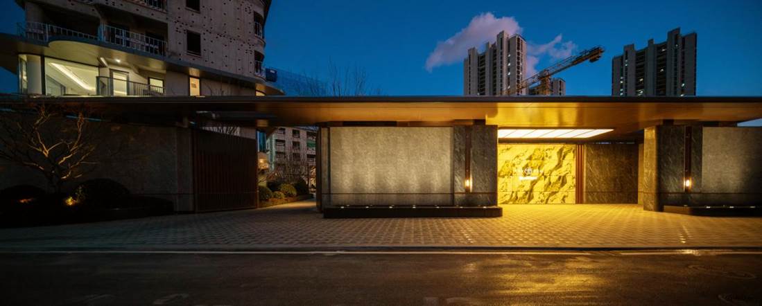 风华之门:西侧大门,入口处以一整面芬迪绿奢石景墙,作为与城市的首次对话。其肌理如凝固的海浪,温润中蕴藏力量,是对青岛山海轮廓的抽象致敬。