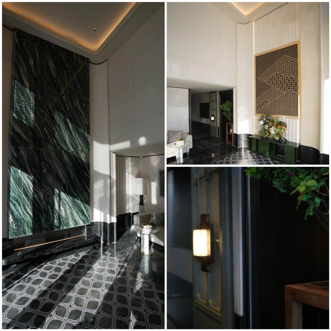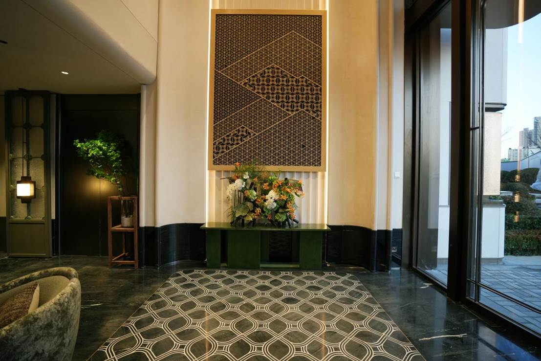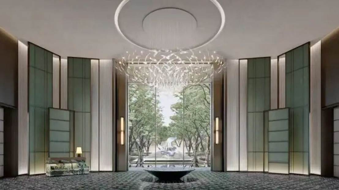 奢雅空间:首层大堂将酒店化设计理念与“珺、玉”属性完美融合,穹顶强化纵向空间感,地面水刀拼花的方胜纹寓意吉祥,墙面弧形处理呼应海浪律动。