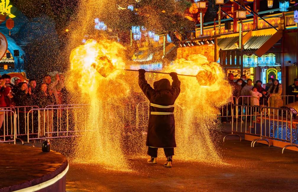 打铁花表演将夜空染成金色星雨,火舞、火秀表演则融合火焰艺术与力量美学,川剧变脸,傩舞等则展现着非遗技艺的现代生命力。此外,游客还将见到糖画、剪纸、泥塑等非遗体验,获取独属于自己的新年礼物。