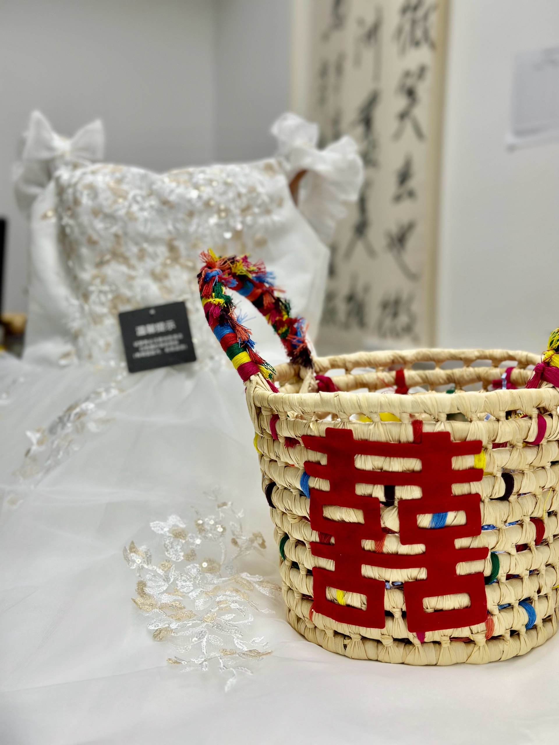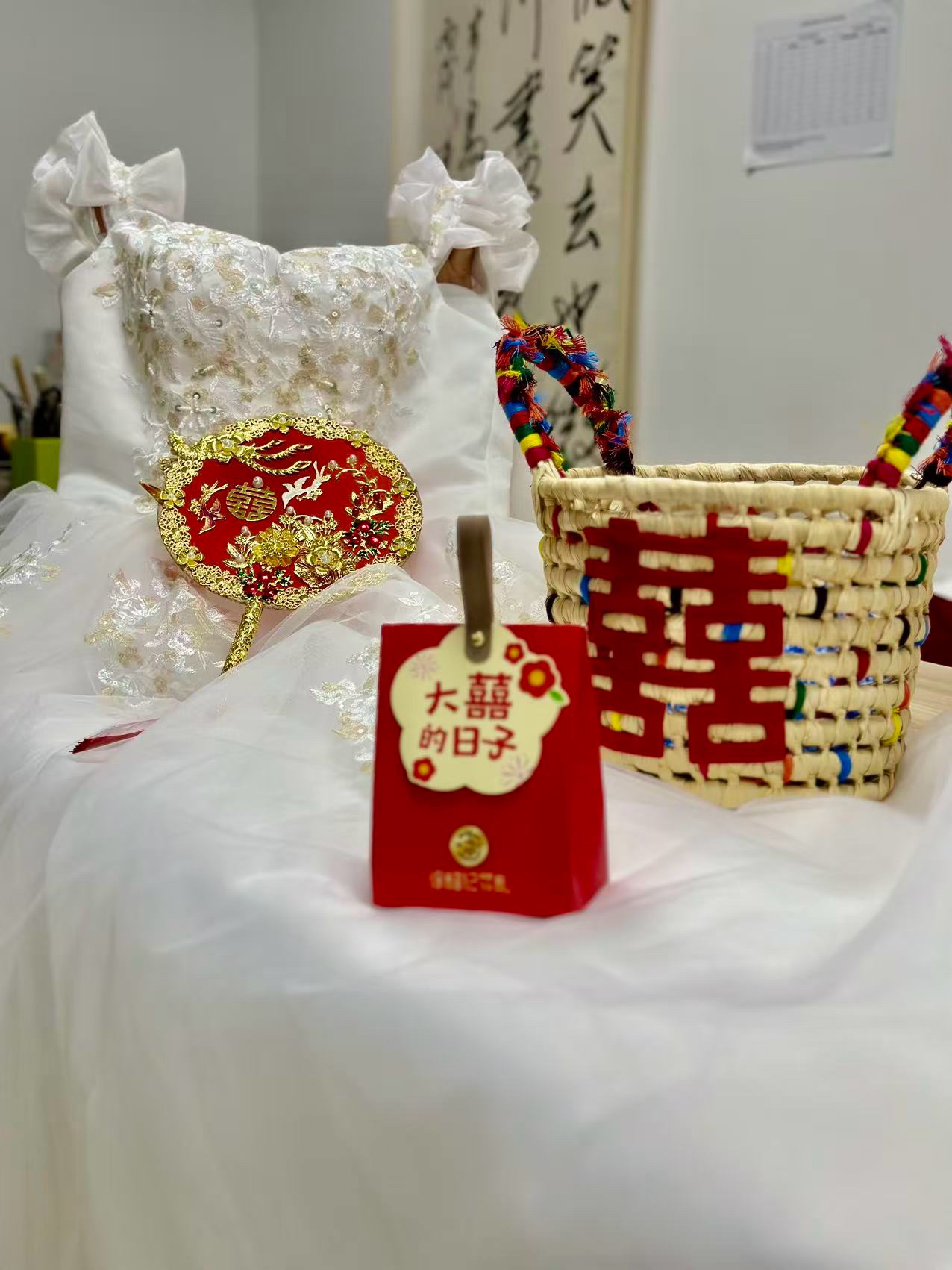此次新人伴手礼包含婚纱、喜扇、红包、徐福记糖果、凯撒冰箱贴、非遗草编筐、非遗花饽饽、手绘长卷等礼品。