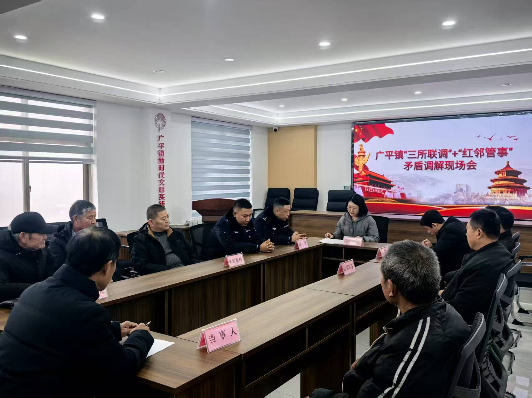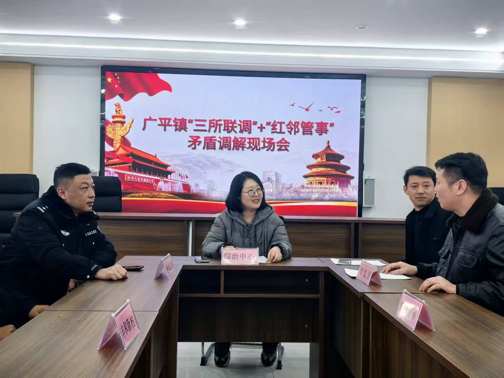 针对较为复杂或积怨较深的矛盾纠纷,广平镇发挥镇综治中心的枢纽作用,构筑“三所联调”堡垒,整合派出所、司法所、律师事务所的专业力量,并联动信访办等部门,形成调解合力。该机制既保留了“红邻管事”接地气、知根底的优势,又注入了法律权威、政策解读、专业调解的“强心剂”,实现了“情、理、法”的有机融合,为矛盾化解提供了坚实的制度保障和专业支撑。