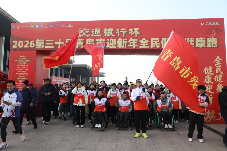 12月28日9时,青岛奥帆中心会议中心前广场人头攒动、红旗飘扬,欢呼声与加油声交织成一片热闹的海洋,“交通银行杯”2026第三十届青岛市迎新年全民健身健康跑在此激情开跑。100余名残疾人代表与健全人跑者活力迸发,身着统一运动服饰的跑者们精神抖擞,随着发令枪响,大家迈着坚定的步伐一起“奔跑”,共同迎接新年的到来,展现了热爱生活、积极向上的精神风貌。