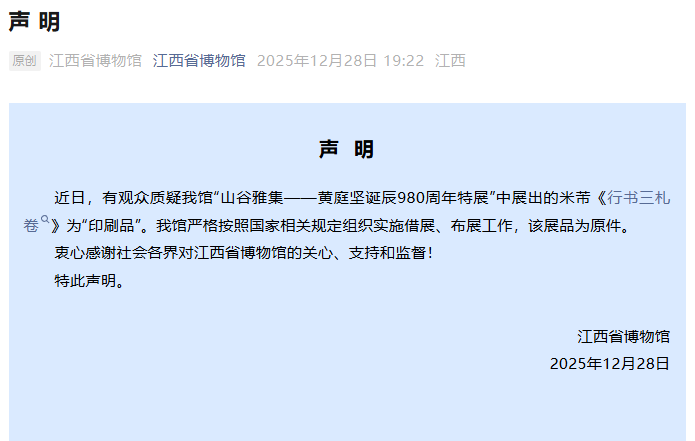 对此,江西省博物馆28日晚发布声明称,该馆严格按照国家相关规定组织实施借展、布展工作,该展品为原件。衷心感谢社会各界对江西省博物馆的关心、支持和监督。