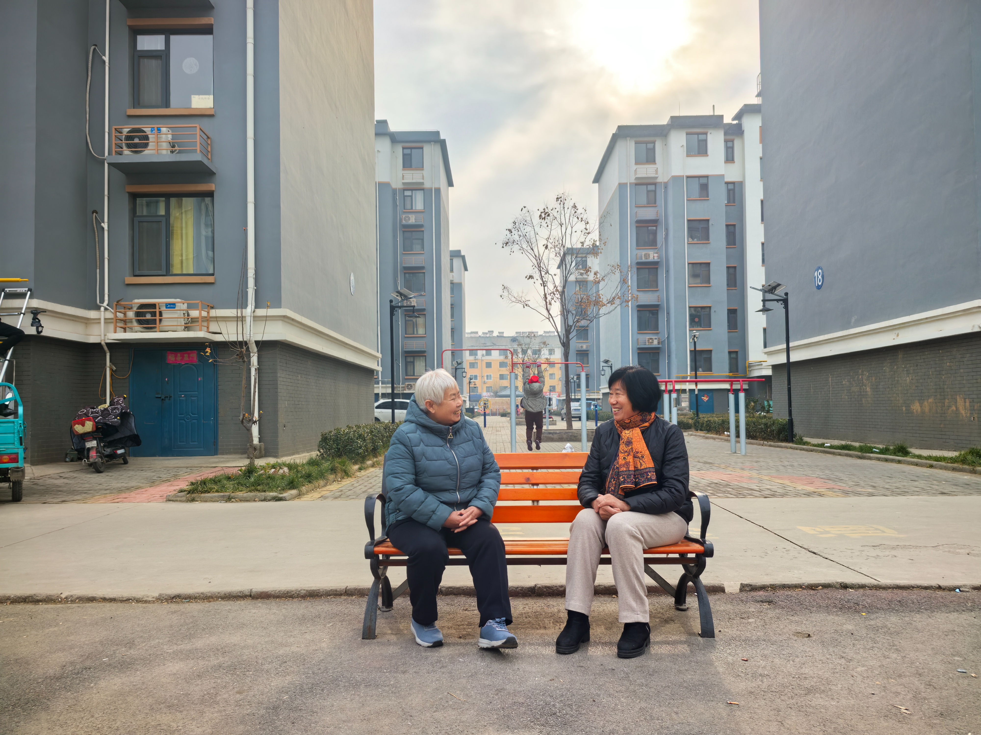 毛桂枝奶奶和网格员郭会君坐在小区长椅上