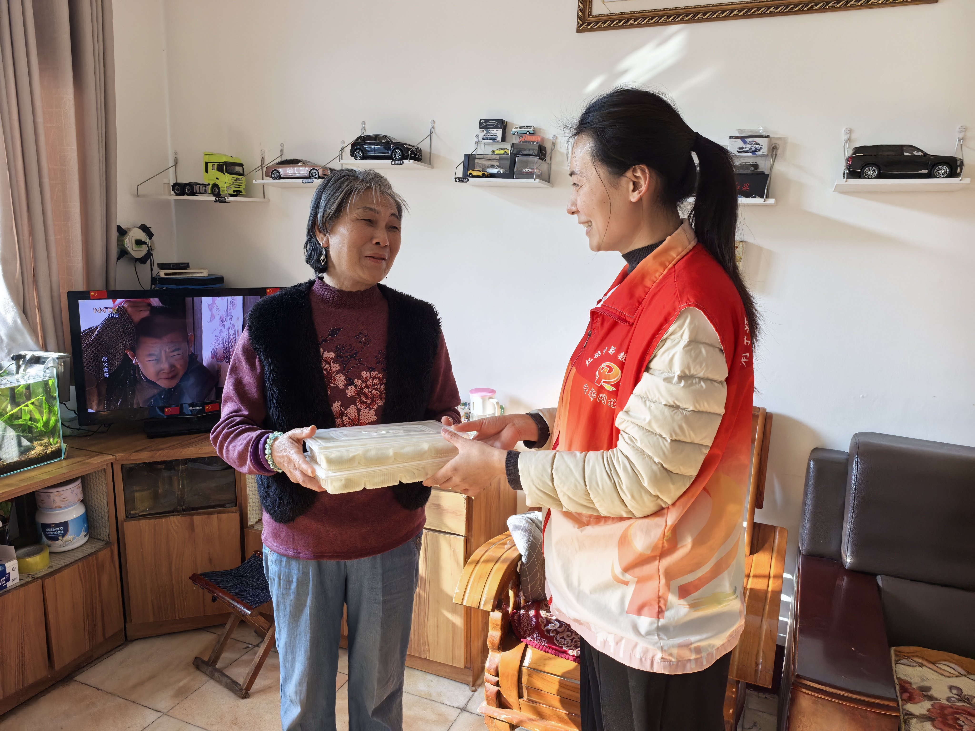 活动当天,社区工作人员和志愿者们早早地来到社区活动室。大家分工明确、密切合作,有的负责和面、调馅,有的负责包饺子,现场呈现出一片忙碌而温馨的景象。经过一上午的辛勤努力,一个个饱满圆润的饺子整齐地排列在盘子里。随后,工作人员和志愿者们将包好的饺子小心翼翼地装进保温盒,分成小组,带着满满的爱心,前往辖区独居、孤寡老人的家中。每到一户,他们都与老人亲切交流,详细询问老人的身体状况和生活情况,叮嘱老人注意保暖,并送上热气腾腾的饺子。