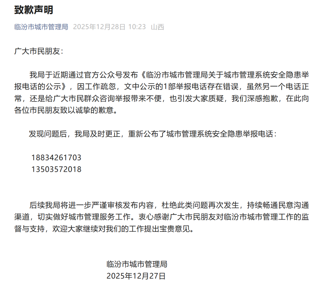 临汾市城市管理局28日发布致歉声明:我局于近期通过官方公众号发布《临汾市城市管理局关于城市管理系统安全隐患举报电话的公示》,因工作疏忽,文中公示的1部举报电话存在错误,虽然另一个电话正常,还是给广大市民群众咨询举报带来不便,也引发大家质疑,我们深感抱歉,在此向各位市民朋友致以诚挚的歉意。(临汾市城市管理局微信公号)