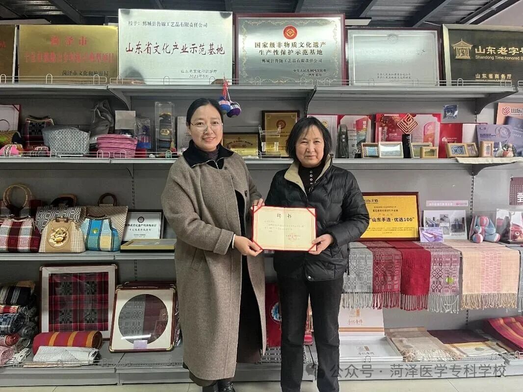 牟翠荣代表学校为国家级非遗传承人刘爱玉颁发“菏泽医学专科学校学业导师”聘书。她表示:“刘爱玉老师是鲁锦织造技艺的活态传承者,她的坚守与创新为我们树立了榜样。聘请刘爱玉老师为实践导师,既是对她多年来非遗传承工作的肯定,也是校地合作推动非遗保护与青年培养的重要举措。”
