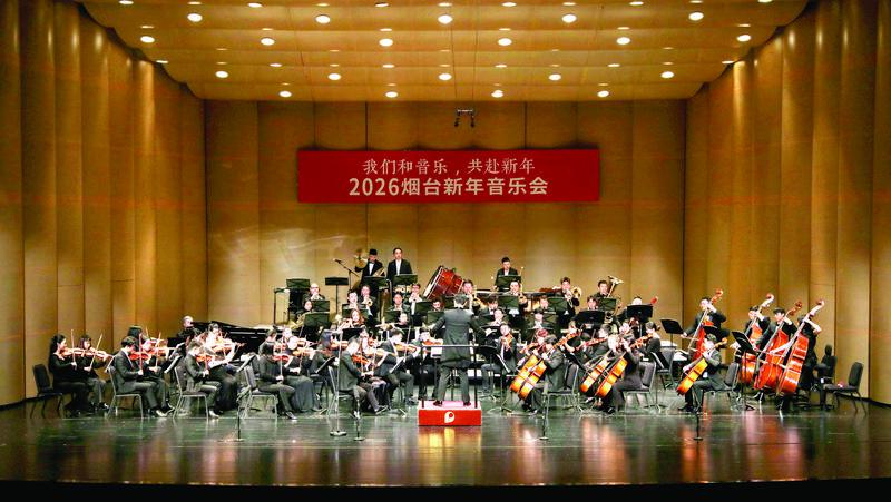 在音乐会的收尾部分,《自由进行曲》带着欢快喜悦奔腾而来,与气势磅礴的《“自新世界”交响曲》第四乐章相继奏响。前者洋溢着收获的欢愉,后者展现出不可阻挡的向上爆发力。整场音乐会通过精心的设计,将烟台的生态之美、发展之脉、人文之韵、奋斗之志与未来之冀,巧妙融入跳动的乐章之中。音乐会在传统返场曲目《北京喜讯到边寨》的热烈欢腾中达到最高潮,全场掌声与乐声共鸣。迎着2026年的曙光,烟台的文化脉动始终与时代同步,与人民同心,共同奔赴更加灿烂美好的明天。