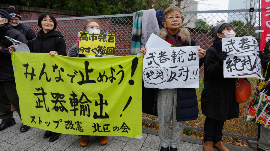 12月25日,民众在日本东京的自民党总部大楼前参加抗议活动。 针对日本执政联盟自民党与日本维新会拟取消对武器出口的5种类型限制、为武器出口大幅“松绑”,日本民众25日下午在位于东京的自民党总部前举行抗议集会。 新华社发