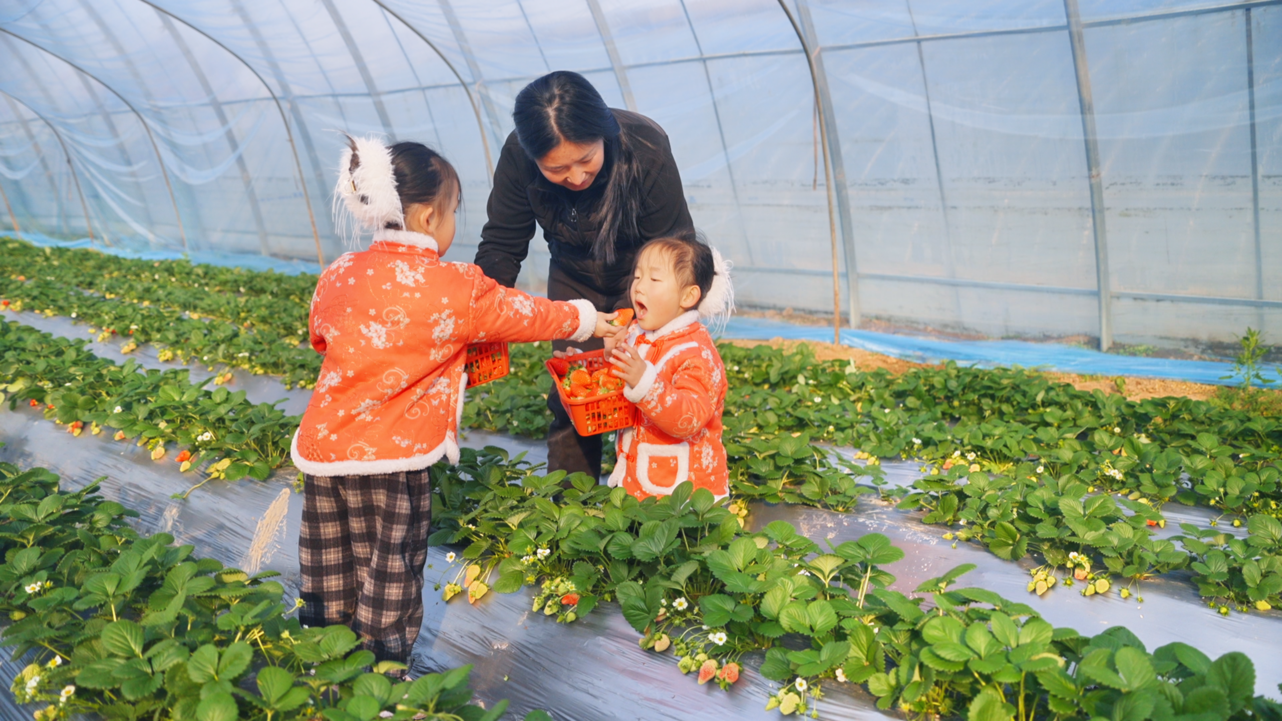 核心采摘区里,标准化大棚整齐排列,推门便是浓郁果香。粉色诱惑、香野、天仙醉等优质草莓挂满藤蔓,色泽鲜亮、饱满诱人。游客们携家带口或约上好友,手提采摘篮穿梭田垄间;孩子们摘下草莓便迫不及待品尝,甜香让笑容绽放。大棚内外,笑声与快门声交织,定格“莓好时光”。棚外40余个摊位组成的特色市集人气爆棚,新鲜草莓及草莓酸奶、果酱、果干等深加工产品,搭配草编、剪纸等非遗手造,满足游客一站式采购需求。舞台上,舞蹈、渔鼓等接地气的文艺节目轮番上演,非遗与乡村场景相融获阵阵掌声;两人三足、投壶掷盘等互动游戏吸引各年龄段游客,现场氛围持续升温。