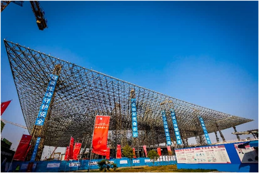 为打造出兼具视觉张力与力学效能的整体结构,项目团队综合运用多项先进建造技术推动工程建设。依托BIM技术开展航线及限高三维空间数据分析,优化现场大型设备布置以严守限高安全红线,通过超高作业精准工况模拟成功突破空域限高问题。为实现“钢铁穹顶”精准合拢,团队创新采用“分块拼装、分区累积提升”技术,运用单点毫米级微调技术对大跨度双曲面超静定网架实施分块智能化提升,圆满达成同步提升、精准定位的建造要求。