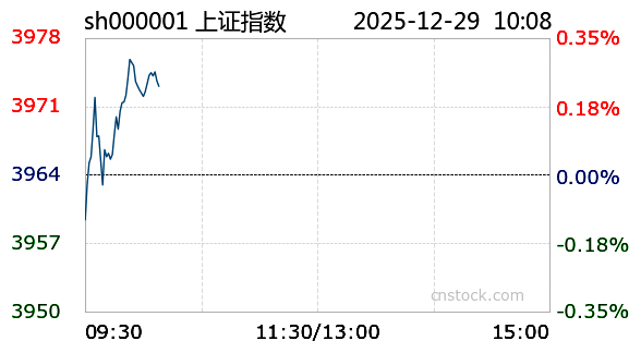 AI小壹12月29日讯 沪市小幅上涨,最高触及3976.63点,最低下探3959.13点,振幅0.24%。截至10:00,上证指数高开3973.35点,涨幅0.24%,成交额3682.37亿元,成交量2.32亿;深证成指报13560.92点,最高13620.14点,最低13545.96点,跌幅0.32%,成交额5013.65亿元,成交量2.98亿创业板报3219.65点,最高3248.22点,最低3213.69点,跌幅0.75%,成交额2134.52亿元,成交量8036.39万