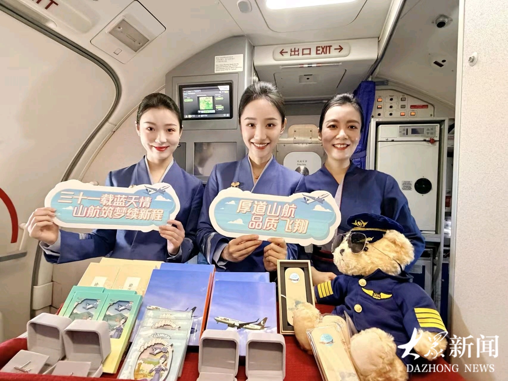 当日,客舱服务部在济南、青岛、烟台、厦门、重庆、北京、乌鲁木齐等地出港的航班上,开展了“三十一载蓝天情,山航筑梦续新程”主题机上活动,与旅客共同回顾公司三十一年来的发展历程。乘务员向旅客讲述山航故事,旅客们静静聆听,并在互动交流中进一步加深了对山航安全理念与企业文化的理解,共同体味“厚道山航 品质飞翔”的品牌愿景。许多旅客提笔写下对山航的真诚祝福,一张张彩色的便签汇集了来自天南地北的温暖寄语,字里行间满载着对山航的认可与期许。