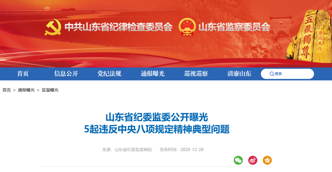 山东省纪委监委网站12月28日消息,2026年元旦、春节将至,为进一步严明纪律要求、弘扬新风正气,日前,山东省纪委监委公开曝光5起违反中央八项规定精神典型问题,分别是: