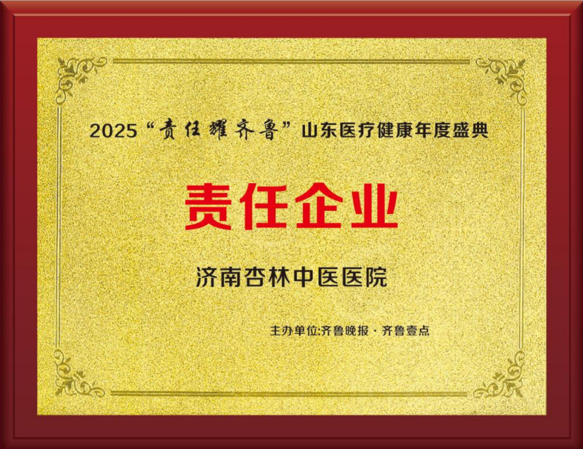 2025年12月27日下午,由山东省卫生健康委员会、山东数字文化集团指导,齐鲁晚报·齐鲁壹点主办的2025“责任耀齐鲁”山东医疗健康年度盛典暨融媒传播分享会在济南大众传媒大厦举行。山东杏林中医医院荣获2025“责任耀齐鲁”年度责任企业。
