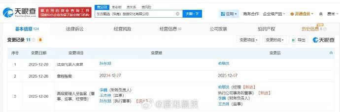 记者查询天眼查发现,近日,东方甄选(珠海)旅游文化有限公司发生工商变更,孙东旭卸任法定代表人、执行董事,俞敏洪接任法定代表人并担任经理、执行公司事务的董事。