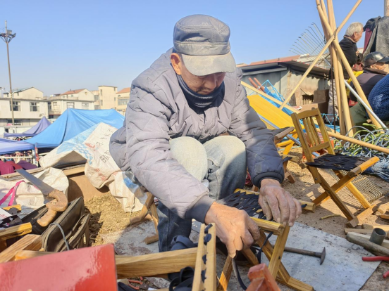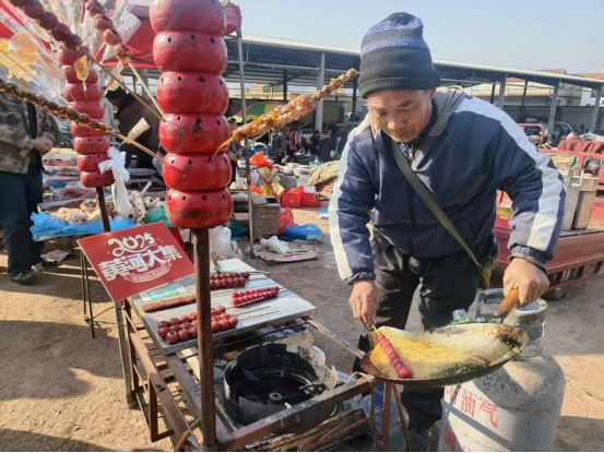 值得一提的是,马庄集的小吃摊位特色十足。刚出锅的油条金黄酥脆,还带着滚烫的温度,咬上一口满是面香;晶莹剔透的冰糖葫芦裹着厚厚的糖衣,酸甜交织的滋味,是大人小孩都爱的冬日甜蜜。不远处,现编马扎的手艺人手指翻飞,竹条在他手中穿梭跳跃,转眼就变成了结实耐用的马扎,引得路人纷纷驻足观看、下单购买;锅碗瓢盆、铁锹锄头、扫帚簸箕等生活用品和农具也摆满了摊位,品类齐全、物美价廉,满足了村民的日常所需。