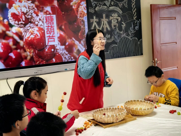 在制作环节,孩子们兴致勃勃地围在桌前,在志愿者的耐心指导下,有条不紊地进行操作。挑选山楂、清洗去核、串成串,再小心翼翼地等待冰糖熬制成晶莹剔透的糖浆。当一串串裹着糖浆的糖葫芦制作完成,孩子们脸上洋溢着自豪的笑容,迫不及待地与同伴分享自己的劳动成果。活动现场还设置了互动分享环节,孩子们拿着自己制作的糖葫芦,讲述着对新年的美好期盼,温馨的氛围感染着在场的每一个人。