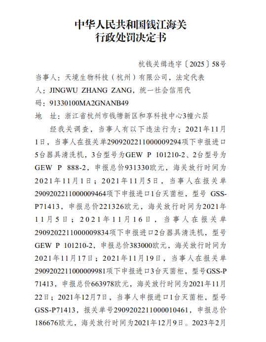 内容显示,经中华人民共和国钱江海关调查,天境生物有以下违法行为:2021年11月1日至2021年12月7日,当事人申报进口清洗机、灭菌柜等12台设备。2023年2月28日及3月3日,因符合《财政部海关总署税务总局关于“十四五”期间支持科技创新进口税收政策的通知》(财关税2021【23号】)的相关规定,当事人就上述进口的 12台设备获得钱江海关出具的5份《海关进出口货物征免税确认通知书》,编号为Z290012340488、Z29012340447、Z29012340490、Z29012340446、Z29012340489,申请退回了上述12台设备进口时已缴纳的关税。