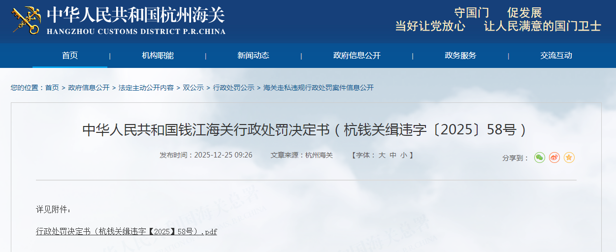 综上,依照《中华人民共和国海关行政处罚实施条例》第十八条第一款第一项、《中华人民共和国海关行政处罚裁量基准(一)》(海关总署公告2023年第182号)第十二条第一项之规定,决定对当事人天境生物科处罚款人民币2.88万元。处罚决定书文号:杭钱关缉违字〔2025〕58号。