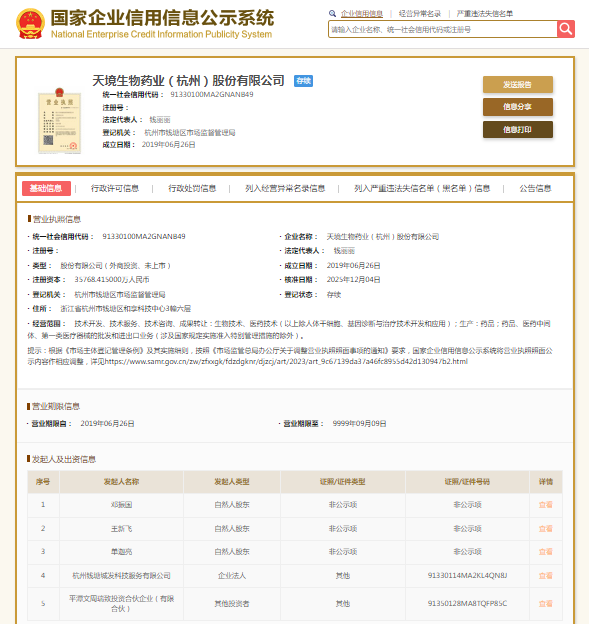 国家企业信用信息公示系统显示,天境生物药业(杭州)股份有限公司成立于2019年,法定代表人钱丽丽,注册资本35768.415万元人民币。变更信息显示,12月4日,其由天境生物科技(杭州)有限公司变更为天境生物药业(杭州)股份有限公司。