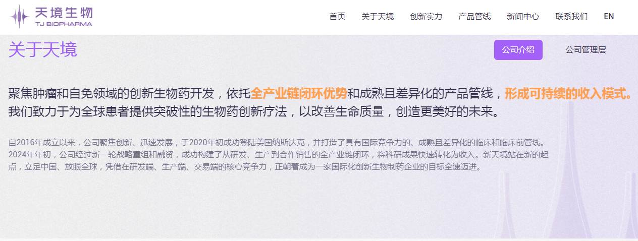 据天境生物官网介绍,公司是一家聚焦于自身免疫疾病、肿瘤免疫和代谢疾病领域创新疗法的全链条生物科技公司。公司立足中国,聚焦全球创新药的研发、临床试验、生物药生产以及产品上市和产品的合作商业化。公司已建成涵盖上海、北京研发中心和杭州GMP生产基地在内的产业链闭环,于2020年初成功登陆美国纳斯达克。