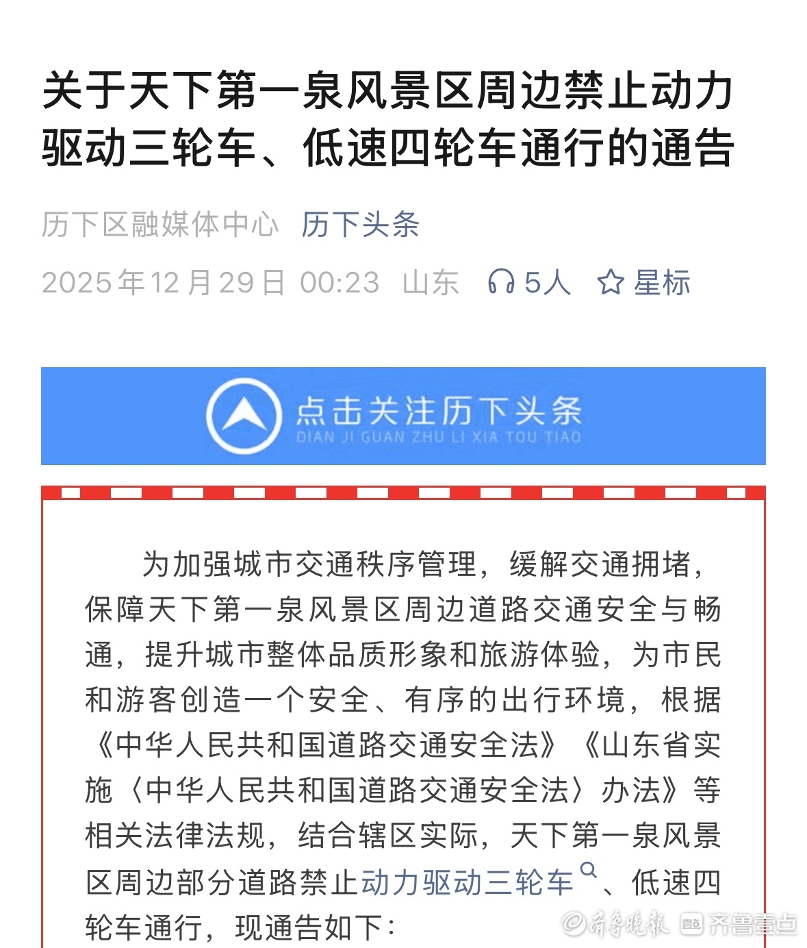 12月29日,济南市历下区、市中区、天桥区联合发布《关于天下第一泉风景区周边禁止动力驱动三轮车、低速四轮车通行的通告》,自即日起,每日9时至24时,在景区周边部分道路对相关车辆实施禁行管理。这也意味着困扰济南多年、影响城市形象与交通秩序的“花车”乱象,有望得到长效治理。