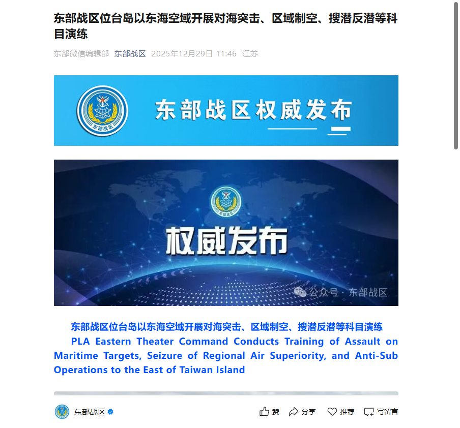 12月29日,中国人民解放军东部战区位台岛以东海空域,组织驱护舰、歼轰机等兵力,开展对海突击、区域制空、搜潜反潜等科目演练,检验了海空协同、精准寻歼能力。微信公众号截图