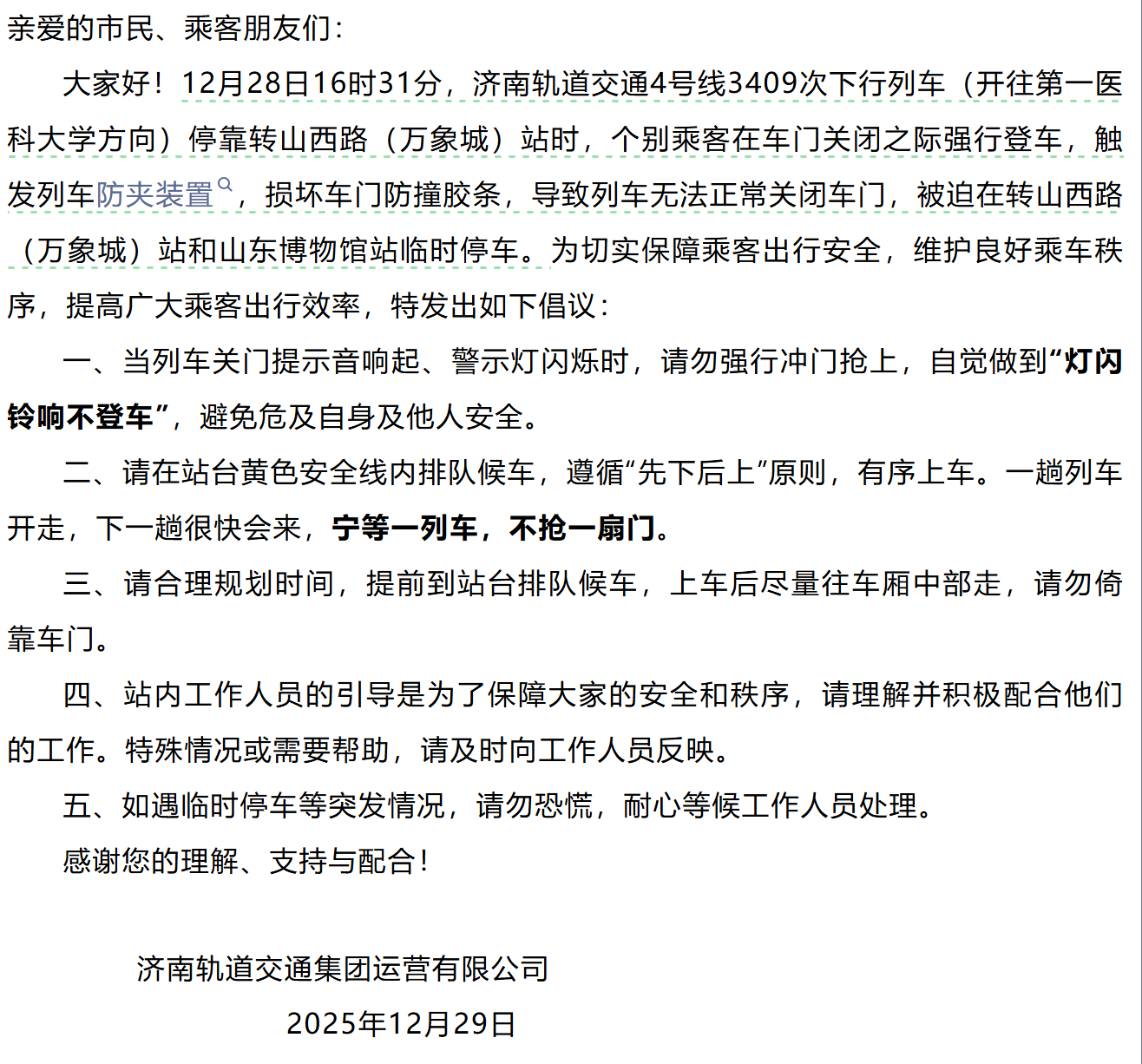 据了解,12月28日16时31分,济南轨道交通4号线3409次下行列车(开往第一医科大学方向)在停靠转山西路(万象城)站时,个别乘客在车门即将关闭之际强行冲门上车,触发列车防夹安全装置,造成车门防撞胶条损坏,车门无法正常关闭。为确保运营安全,该列车被迫在转山西路(万象城)站及后续山东博物馆站临时停车,对线路运行秩序和乘客出行效率造成一定影响。