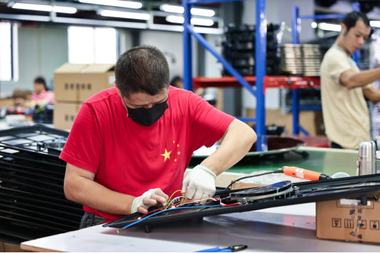 ▲ 工人正在为暖菜板安装电子元件。李源|摄
