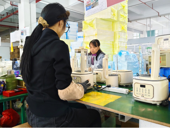 ▲ 为保障产品质量,工人在破壁机打包发货前对各项功能稳定性进行再次检测。曾邵|摄