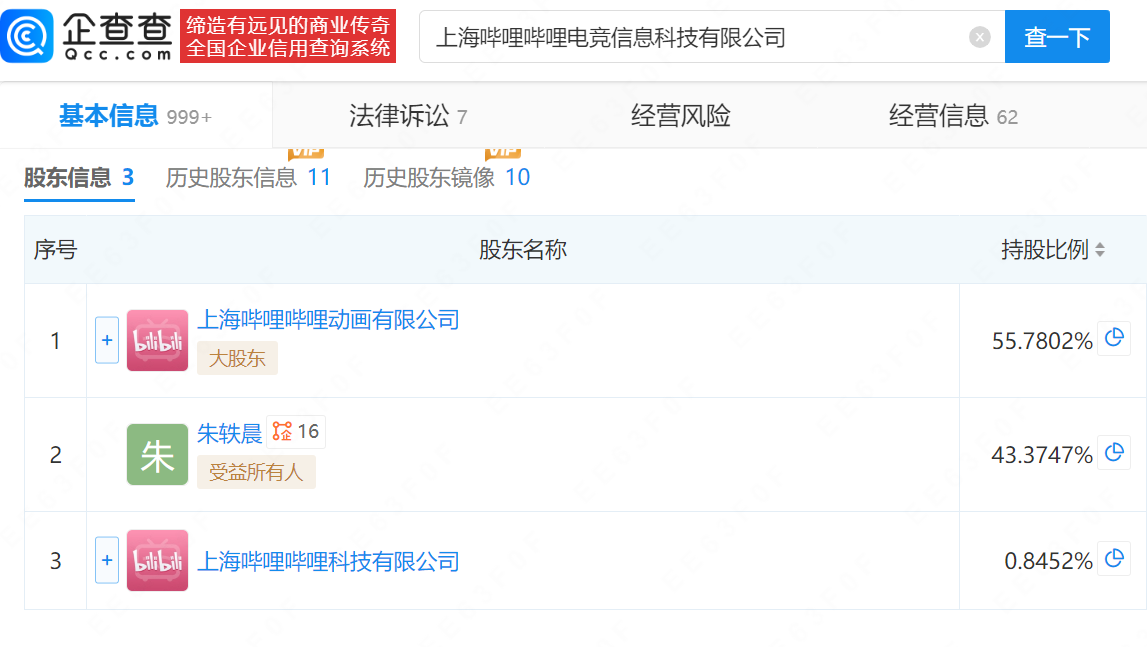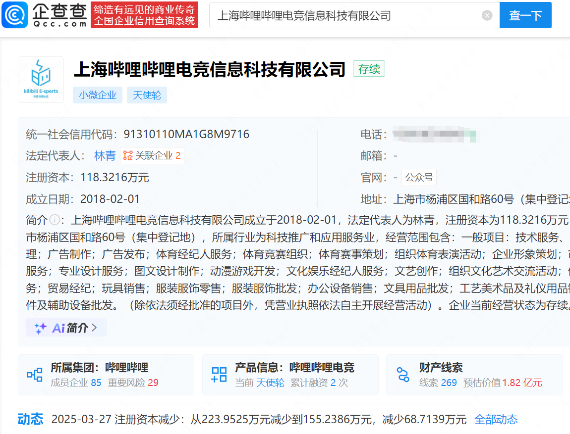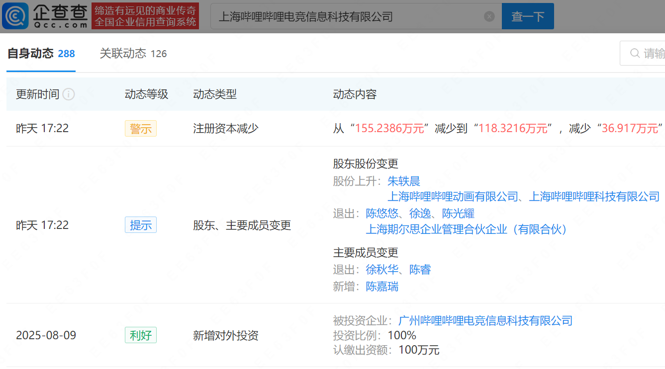 企查查APP显示,近日,上海哔哩哔哩电竞信息科技有限公司发生工商变更,陈睿卸任财务负责人,由陈嘉瑞接任,同时多名主要人员发生变更。此外,公司注册资本从约155万元减至约118万元,降幅约23.78%;该公司成立于2018年2月,法定代表人为林青,经营范围包含动漫游戏开发、体育赛事策划等,现由上海哔哩哔哩动画有限公司、上海哔哩哔哩科技有限公司等共同持股。(企查查)
