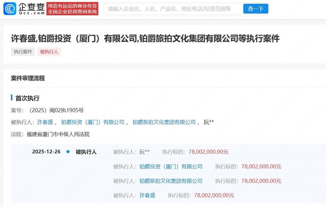 值得关注的是,此次7800万余元的强制执行并非铂爵旅拍首次陷入司法纠纷。据媒体此前报道,早在今年7月和9月,铂爵旅拍就曾两度被厦门市翔安区人民法院列为被执行人,执行标的分别为2.2万元和2.59万元。而就在此次执行信息披露前的11月,许春盛、谢家章、许春德等核心股东及关联投资企业已因另一案件被厦门中院强制执行1.75亿余元,具体被执行原因未对外披露。