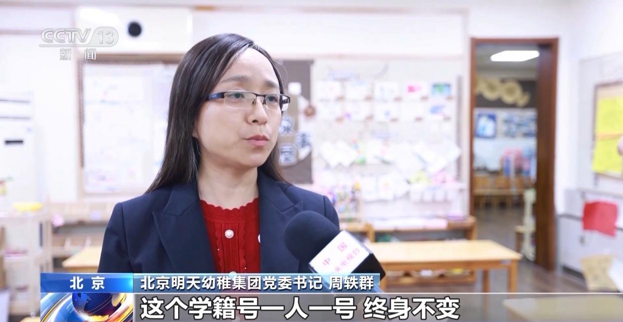 北京明天幼稚集团党委书记 周轶群:孩子从入幼儿园开始,学籍号一人一号,终身不变。所有的学前儿童的学籍信息,也和义务教育的学籍信息系统实现了数据共享,到了小学不用再做重复的采集。建立起学籍之后,对于幼儿园能够实现底数清晰的管理,孩子的年龄结构、入园来源、生源去向,有利于幼儿园和小学做好双向的科学衔接工作,有助于保教质量的提升。