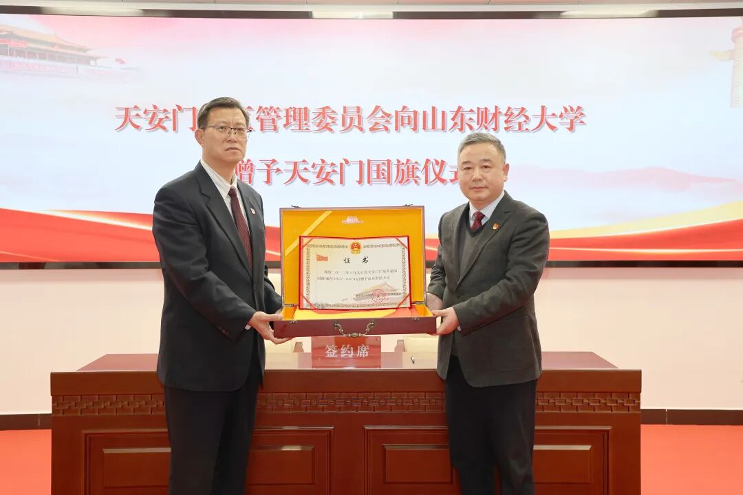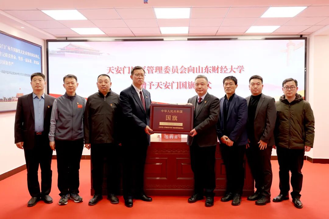 12月24日,北京市人民政府天安门地区管理委员会向山东财经大学赠予天安门国旗仪式在天安门地区管理委员会国旗教育馆举行。天安门地区管委会党组成员、副主任姚辉(正局长级)向学校赠送国旗。校党委书记查玉喜代表学校与北京市人民政府天安门地区管理委员会签署国旗赠予协议并接受赠予。