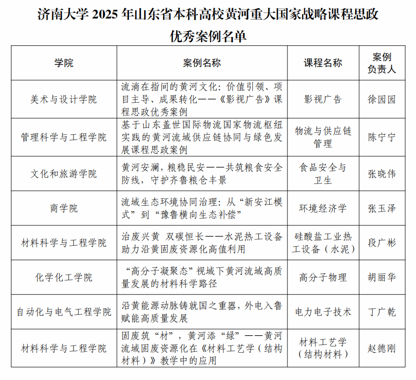 近日,山东省高等学校课程思政研究中心正式公布2025年山东省本科高校黄河重大国家战略课程思政优秀案例名单,济南大学推荐的8个案例全部入选,充分体现了学校在课程思政建设与黄河重大国家战略深度融合方面的显著成效。