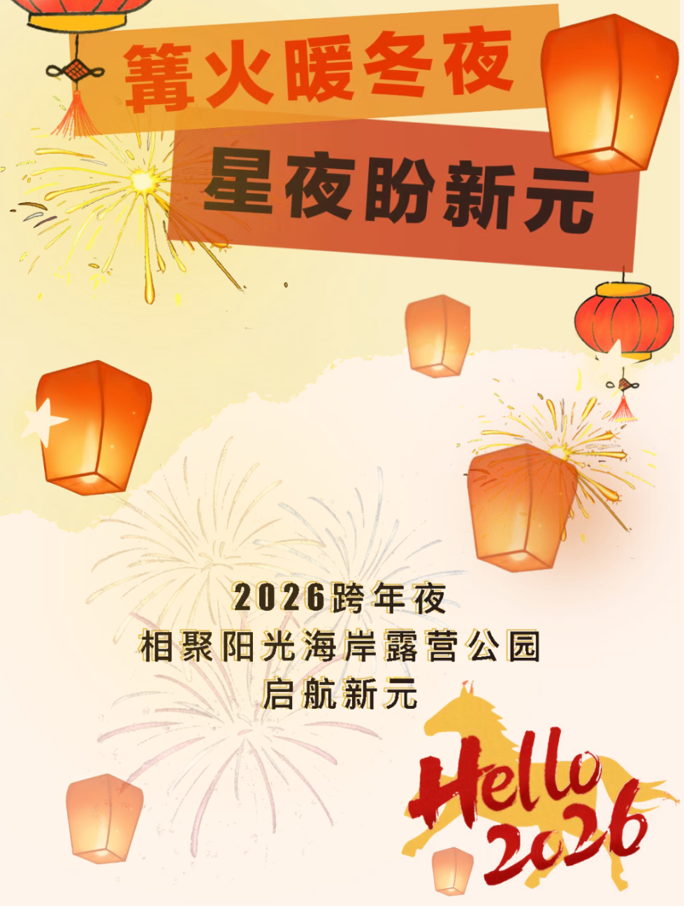活动内容:当鸥鸣漫过日照山海,星光点亮夜空,辞旧迎新的序章悄然开启——2026「鸥遇山海 马上出片」跨年活动邀你赴约!巨幕实时转播跨年晚会盛况,沉浸式解锁岁末狂欢;空中投影万人同频倒计时,定格时光交汇瞬间;携手放飞祈愿孔明灯,让满心期许漫向天际;跨年夜的狂欢未尽,元旦清晨的美好已然启程:暖橘色篝火燃亮沙滩,迎接新年第一缕晨光;与温顺小马并肩伫立,解锁沙滩萌趣合影。赴一场与2026的山海之约,同赴旧岁,共启新程!