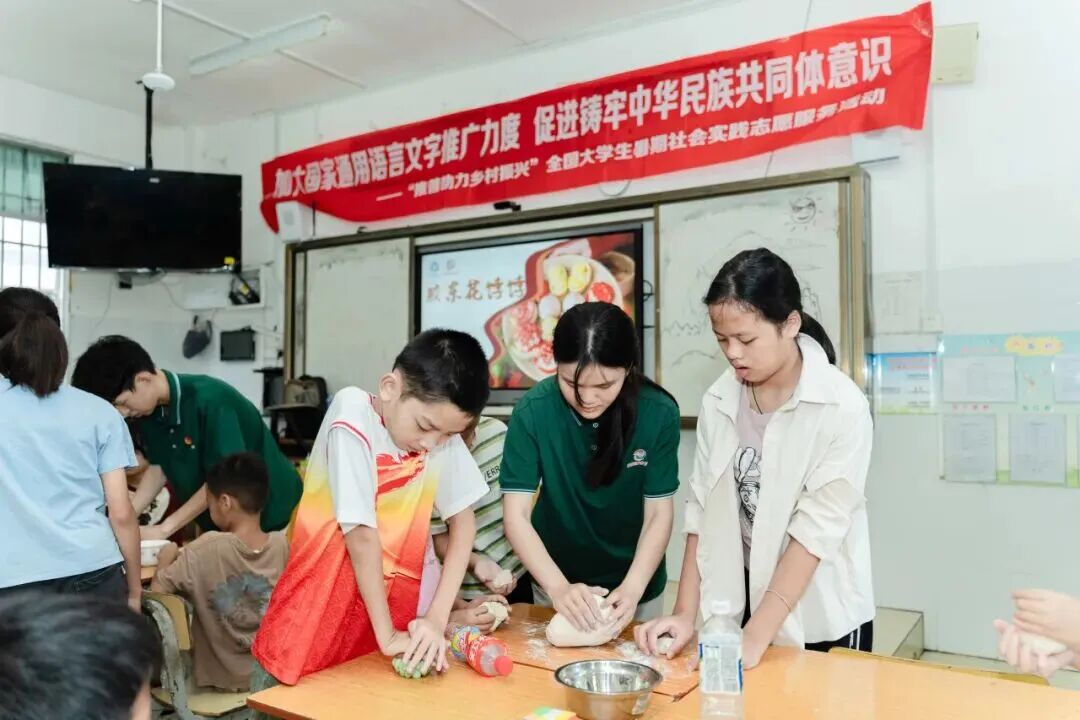 面向当地留守儿童,团队灵活运用游戏化教学、情景教学等方式,创新开设“推普+”系列特色课程,通过花饽饽制作、“乡音乡味·美食推普”配音、“非遗主题版”你画我猜等活动,激发孩子们的语言学习兴趣与实际运用信心。