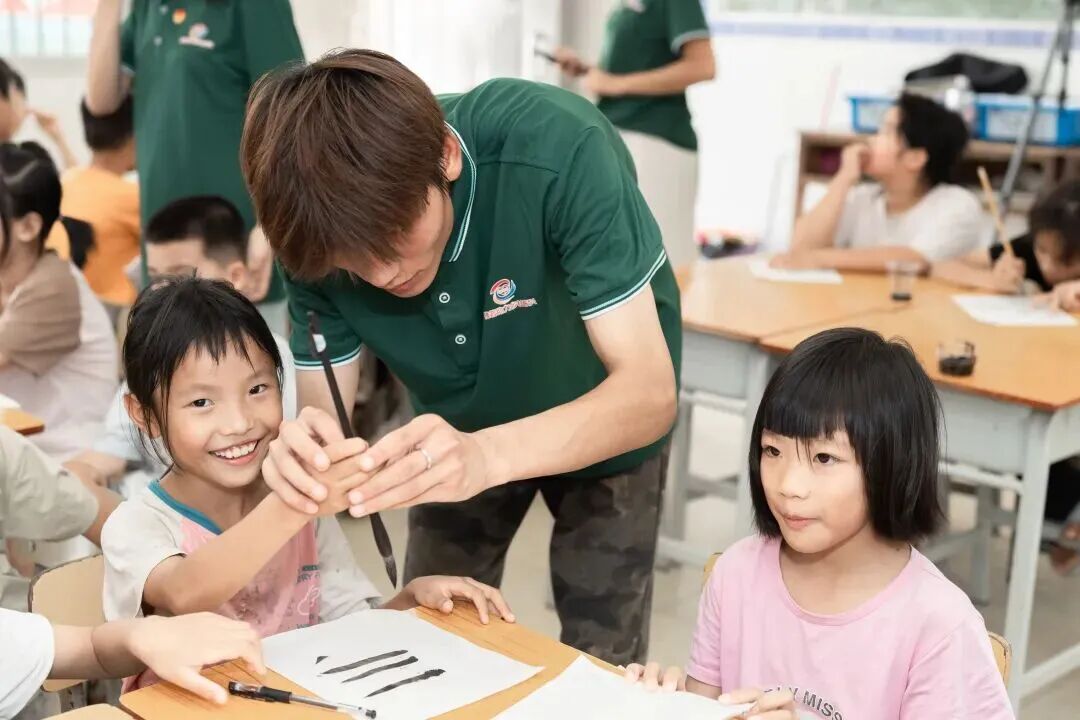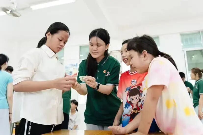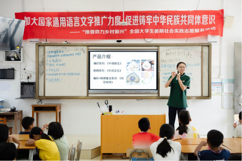 同时,志愿者们将山东非遗项目树叶刺绣与广西忻城非遗壮锦引入课堂,通过现场指导树叶刺绣实践与“我是壮锦代言人”推介活动,引导孩子们学习使用清晰、标准的普通话,巧妙融合国家通用语言文字推广与中华优秀传统文化传承,在乡村青少年心中厚植文化自信。